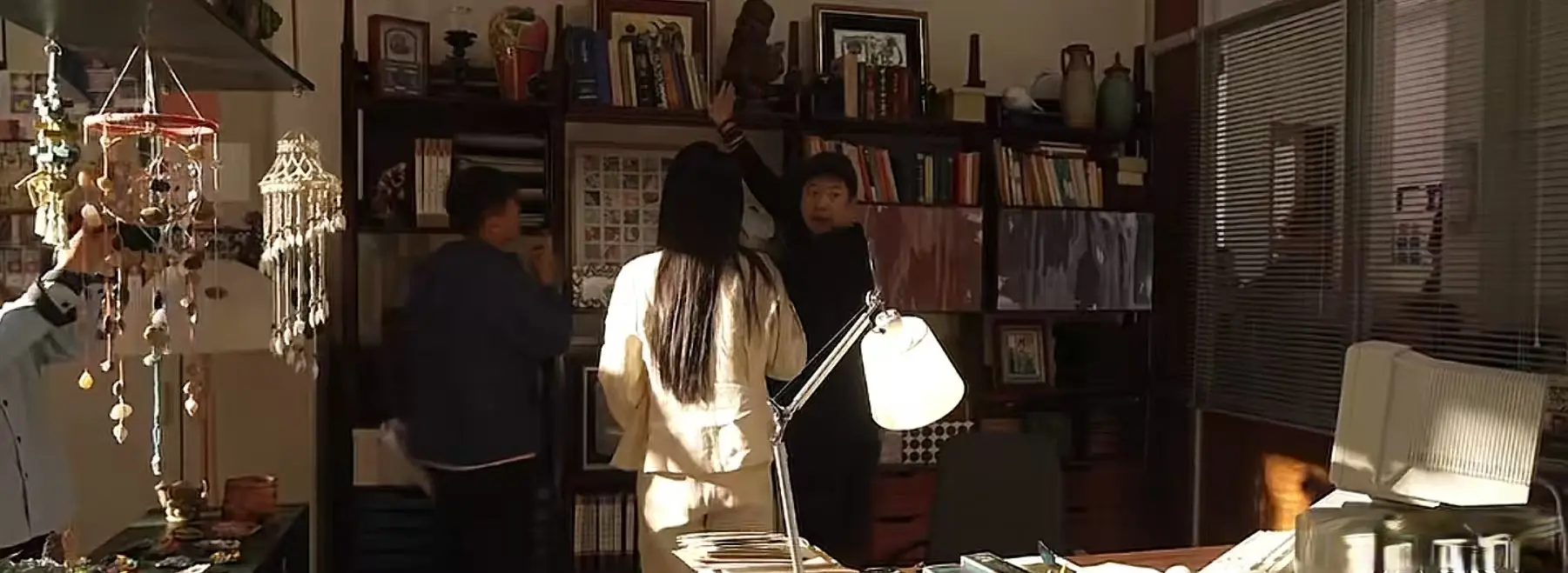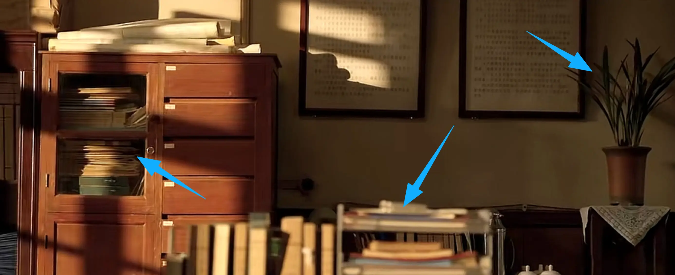 你看李秋萍的办公处, 实木文件柜是80年代机关单位的标志性家具,深棕色的木质纹理带着磨损痕迹。