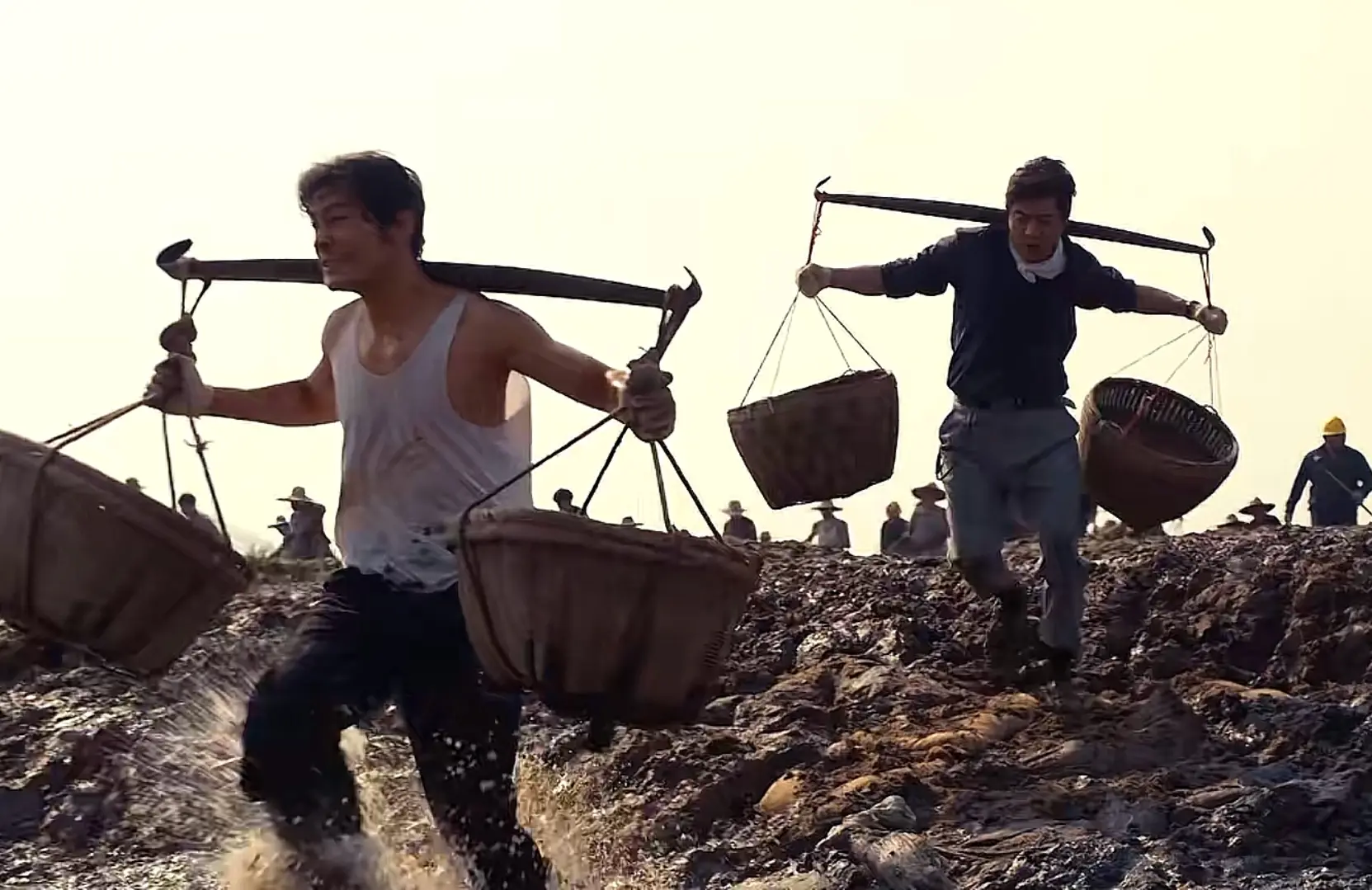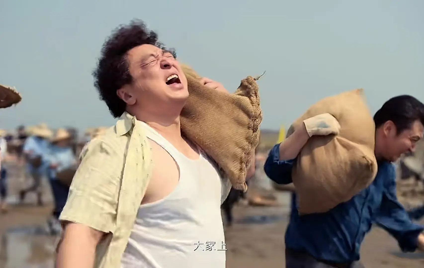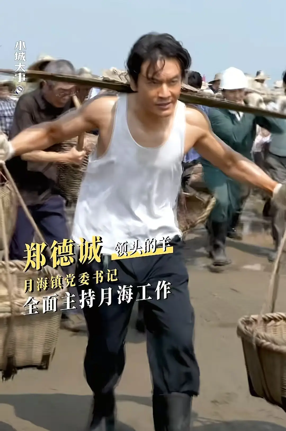 当月海人齐心协力一起修路时,他们用双脚迈过泥潭,肩背上扛着扁担,挥洒着汗水向前跑。