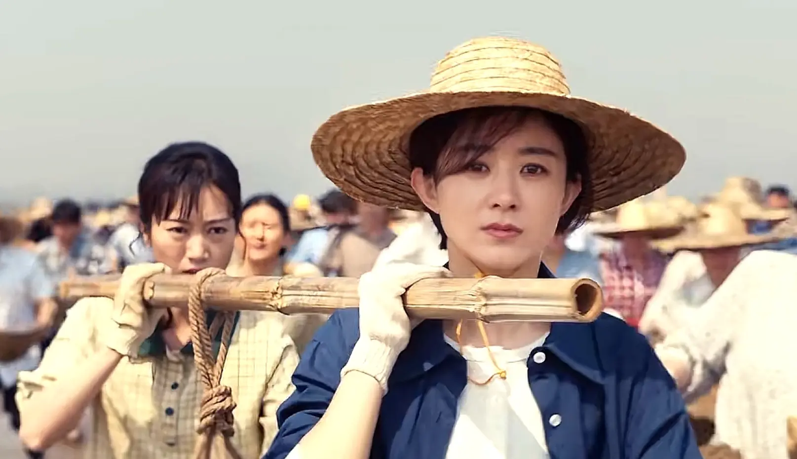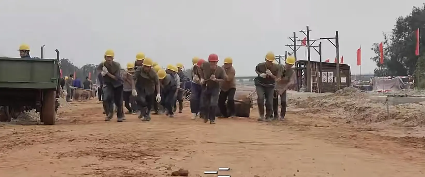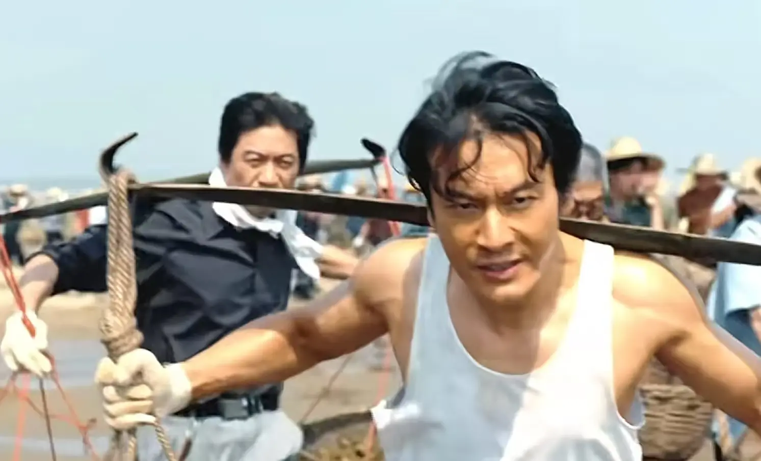 当月海人齐心协力一起修路时,他们用双脚迈过泥潭,肩背上扛着扁担,挥洒着汗水向前跑。