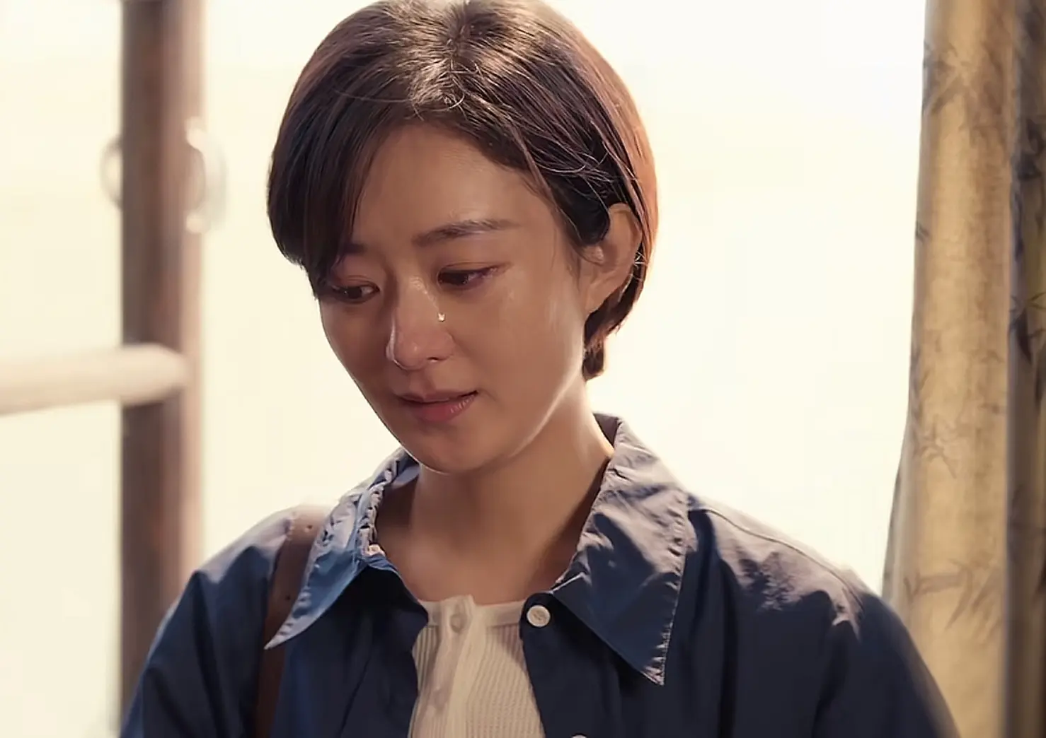 再戴着老式黑框眼镜,面部皮肤有刻意做的粗糙感,头发被帽子压得服帖,没有多余修饰,完全褪去了精致感。