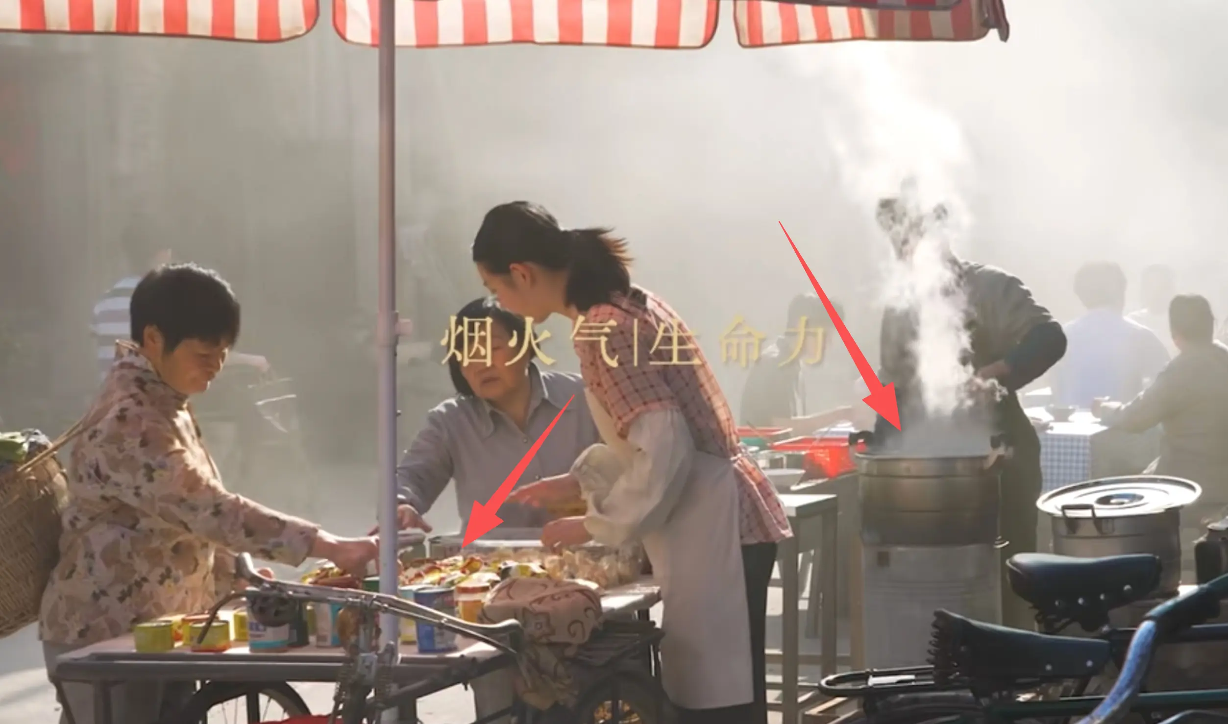看那红白条纹遮阳伞下的早点摊,木桌案上摆着油润的糕点、码得整齐的面点,竹篮里还装着刚摘的新鲜蔬菜。