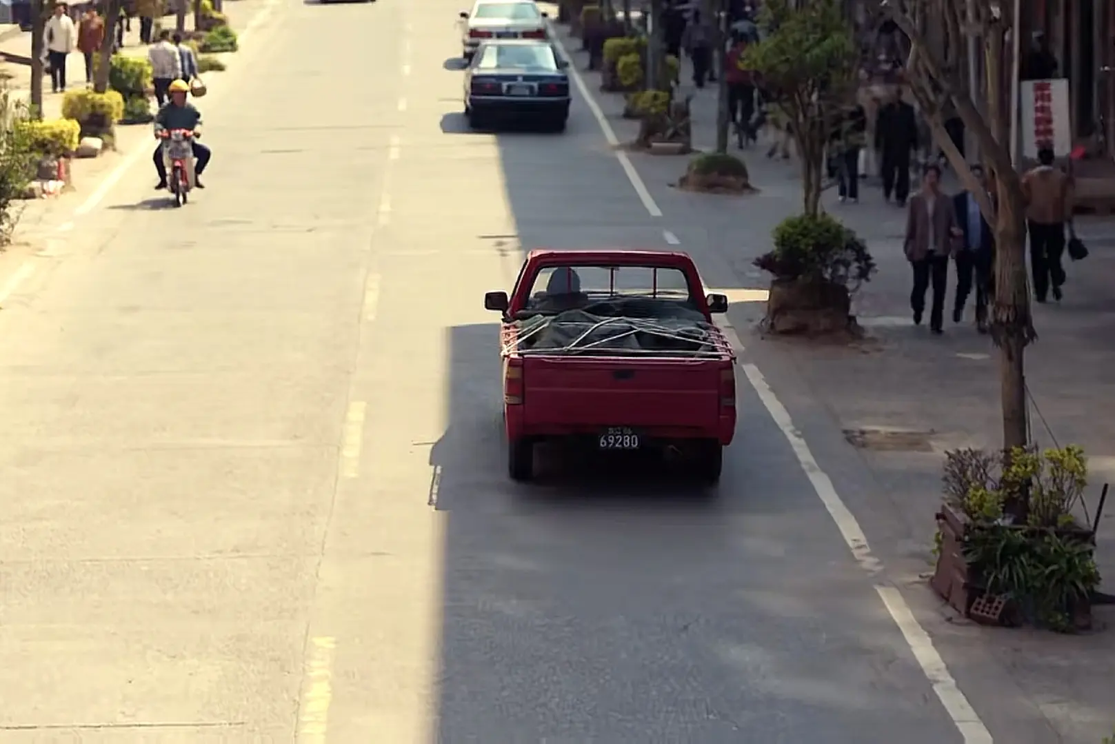 还有这个红色皮卡是日产D21,常被称作日产皮卡王,这款车在80年代末至90年代初的沿海城镇极为常见。