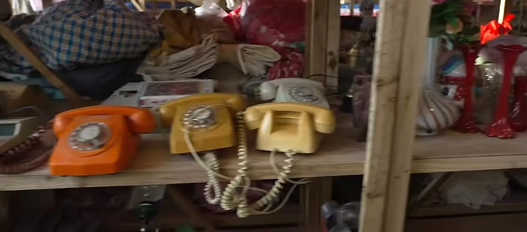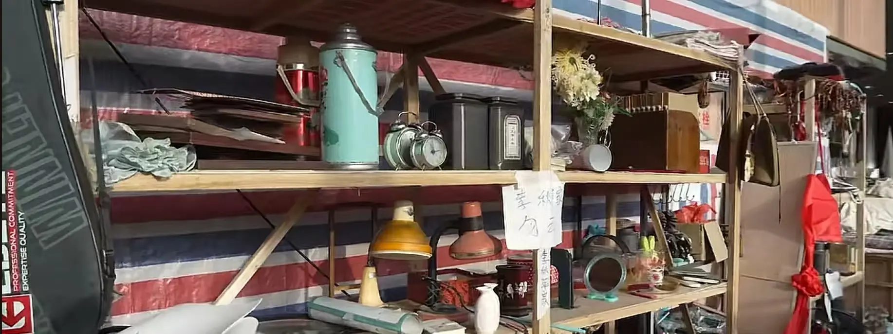 镜台前摆着的老式发胶瓶、卷发器、陶瓷梳,还有玻璃柜里的卡带收音机。