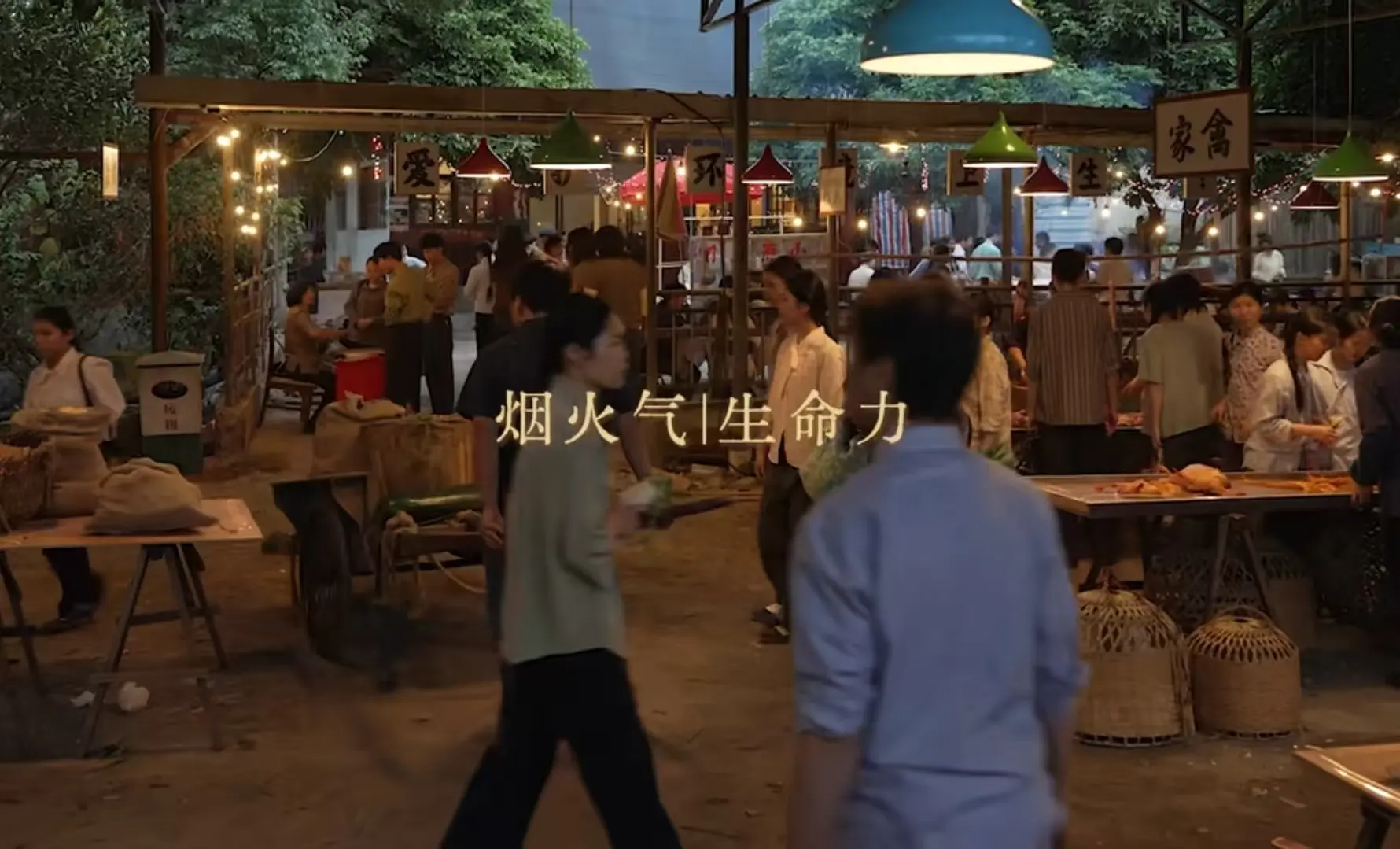 头顶的彩色吊灯晃悠悠亮着暖光,在暮色里把摊位照得透亮,招牌上“家禽”的毛笔字带着磨损的痕迹,旁边还贴着“爱环卫生”的标语,混搭出80年代市场的质朴感。