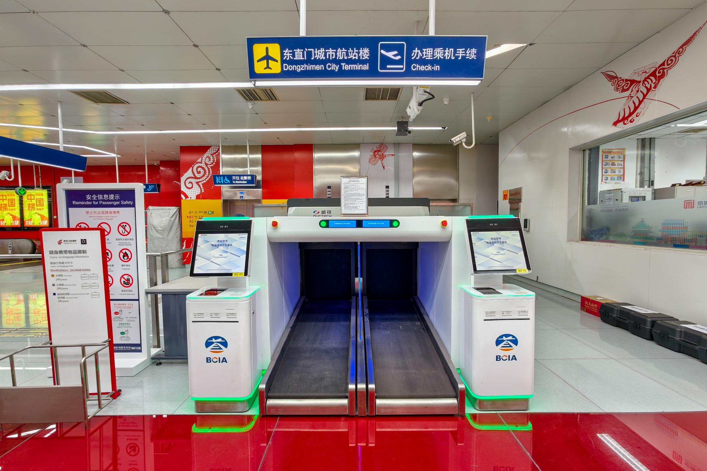 今天上午,记者来到首都机场线东直门站B1层看到,东直门城市航站楼增加了自助值机托运设备,旅客只需要点击屏幕,按照提示操作,将行李放在传送带上,再绑上行李牌,就能自动完成值机和托运手续,整体操作流程与机场自助值机没有区别。完成托运的行李会经过安检仪,进入后方区域等待运送上车。而旅客则可以转身刷卡进入闸机,搭乘地铁前往机场。