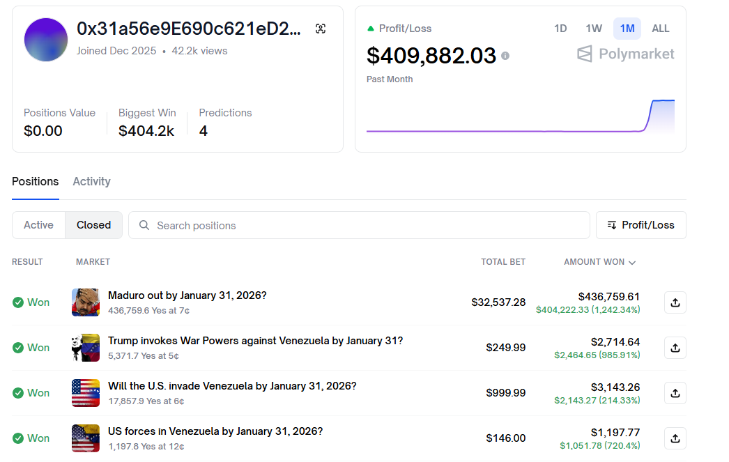 获胜者账户的创建时间和押注事件更让内幕交易之说甚嚣尘上。一个创建于12月27日的新账户仅在“美国入侵委内瑞拉”和“马杜罗将在1月31日前下台”这两件事情上押注。