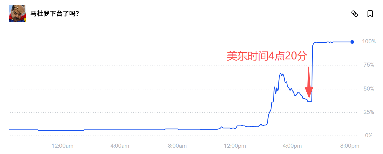 据报道,在特朗普于美东时间周六约4点20分宣布马杜罗被捕之前,预测市场Polymarket在周五晚间出现了一波押注热潮。“马杜罗下台”的概率已连续数周维持在5%至6%,但在美东时间周五晚上10点出现了攀升,并在凌晨3点出现了一个小高峰。