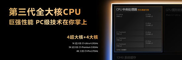 天玑9500采用台积电3nm(N3P)工艺制程,集成超过300亿个晶体管,搭载Arm全新架构,首次推出“第三代全大核”CPU设计,由1颗主频高达4.21GHz的C1-Ultra超大核、3颗3.5GHz的C1-Premium大核及4颗2.7GHz的C1-Pro能效核组成。GPU方面,天玑9500集成了G1-Ultra MC12图形处理器。